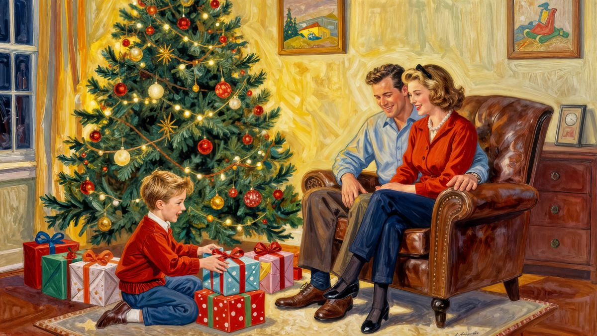 This acrylic painting captures a joyful 1950s Christmas morning in a suburban home, with parents and children opening presents by the tree.