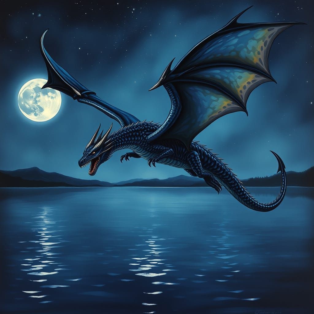 This dreamy, ethereal painting captures a majestic night-colored dragon in flight, set against a serene, star-studded sky and a tranquil, moonlit lake. Rich, textured brushstrokes and muted colors evoke the works of the Old Masters.