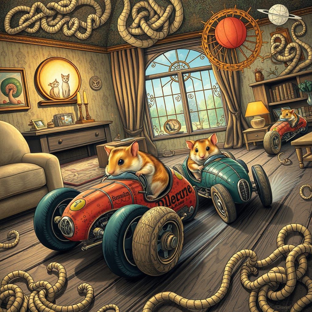 A hyperrealistic illustration shows hamsters racing miniature cars through a detailed living room. The artwork features intricate knots, vines, and optical illusions in pastel colors, with dramatic lighting and volumetric effects.
