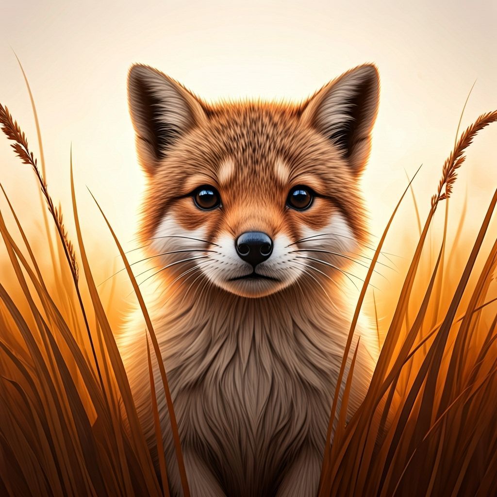 This image features a light brown animal with soft, mottled fur peeking from tall summer grass during a warm amber sunset, rendered in impressionistic painterly swirls.