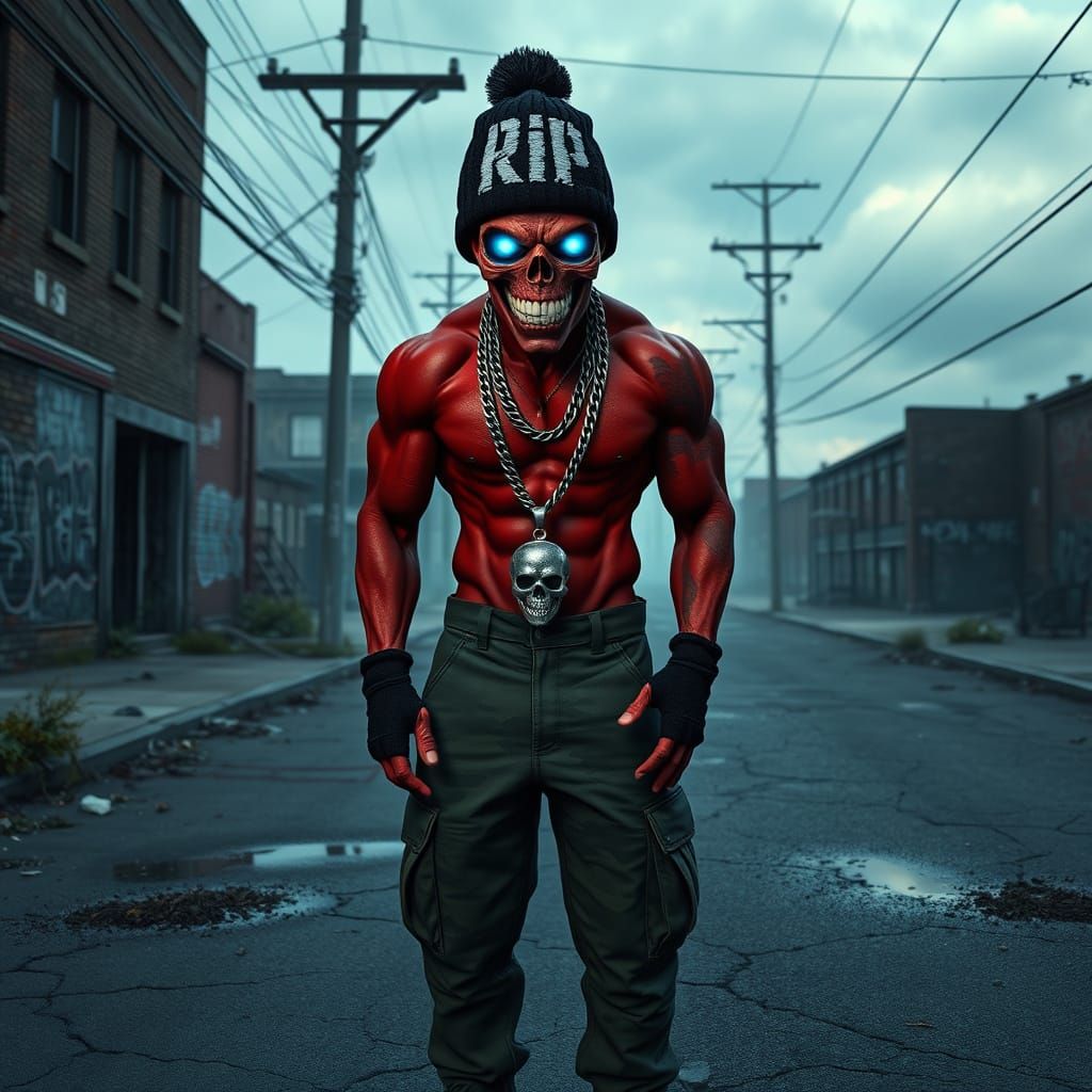 A highly detailed 3D rendered character with a creepy yet charismatic vibe: a muscular, skinless figure with exposed red muscles, a wide toothy grin, large glowing blue eyes, and a skull-like face. He is wearing a black pom-pom beanie with RIP written in white capital letters across the front, multiple ...