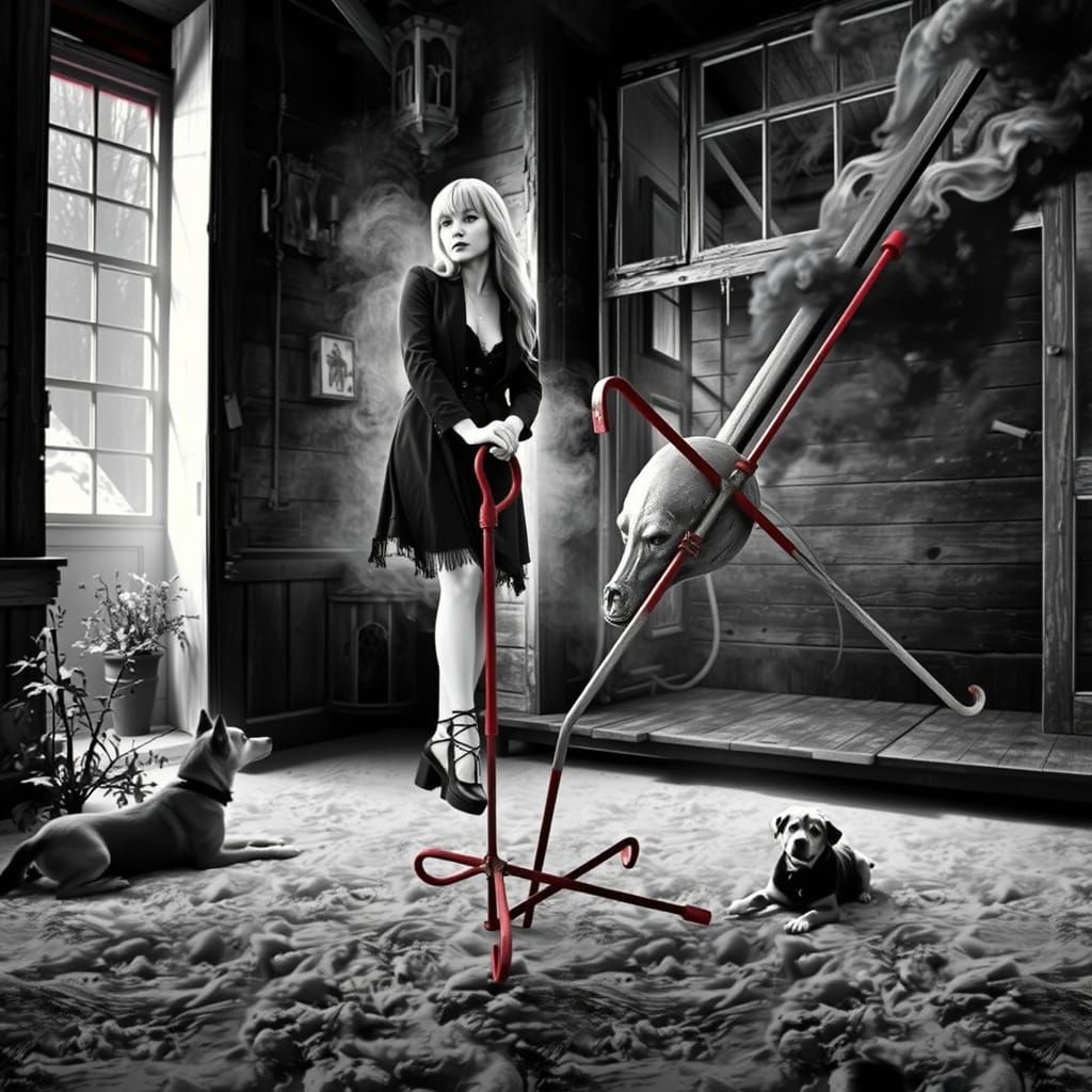 A striking black and white image shows a goth fashion model with a rusted iron sculpture in a decaying house. Hints of red neon light add to the atmospheric, grainy film aesthetic.