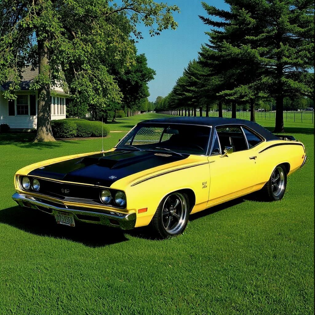 This image features a classic American muscle car, a high-performance two-door vehicle with a powerful V8 engine and rear-wheel drive, embodying 1960s automotive design.