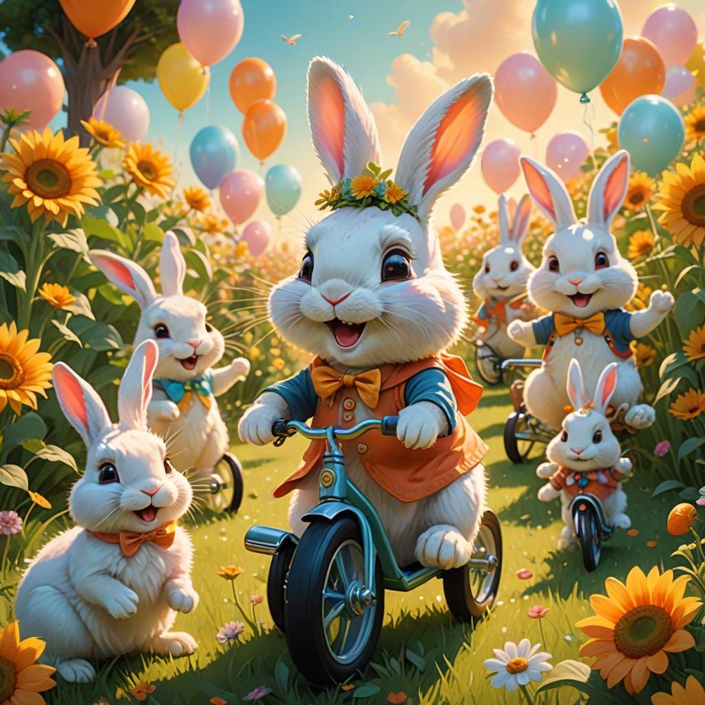 In un prato luminoso e fiorito, sotto un cielo azzurro punteggiato da nuvolette soffici, una banda di cuccoli conigli festeggiano. Alcuni saltellano tra girasoli e margherite, altri si rincorrono in cerchio come in una danza gioiosa. Un coniglietto bianco con occhiali da sole guida un triciclo decorato ...