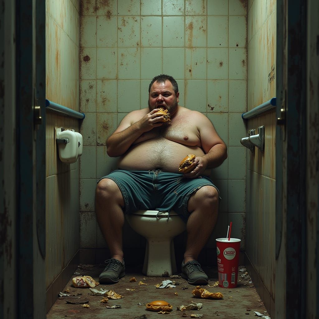 This image shows a very overweight man on a dilapidated toilet in a gas station bathroom. The scene, reminiscent of dark etchings, is illuminated with ominous, high-contrast lighting.