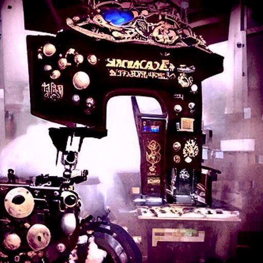A digital rendering of a steampunk arcade machine. The machine features intricate gears, brass accents, and a vintage aesthetic, reminiscent of a bygone era reimagined with advanced technology.