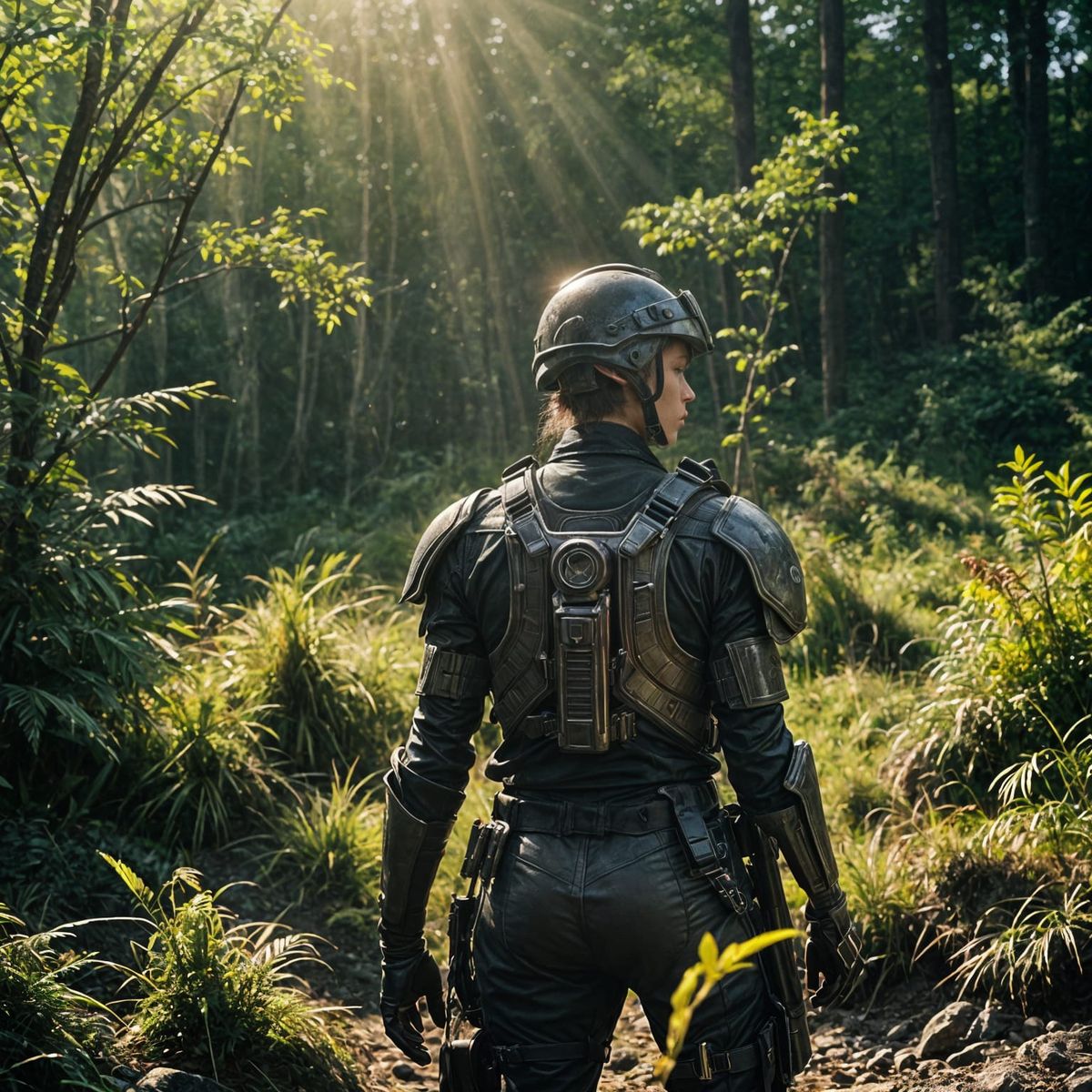 This image shows a female trooper standing in a sun-drenched forest. The scene has a cinematic quality, with film grain and dramatic lighting, resembling a still from a live-action film. The style is hyperrealistic.