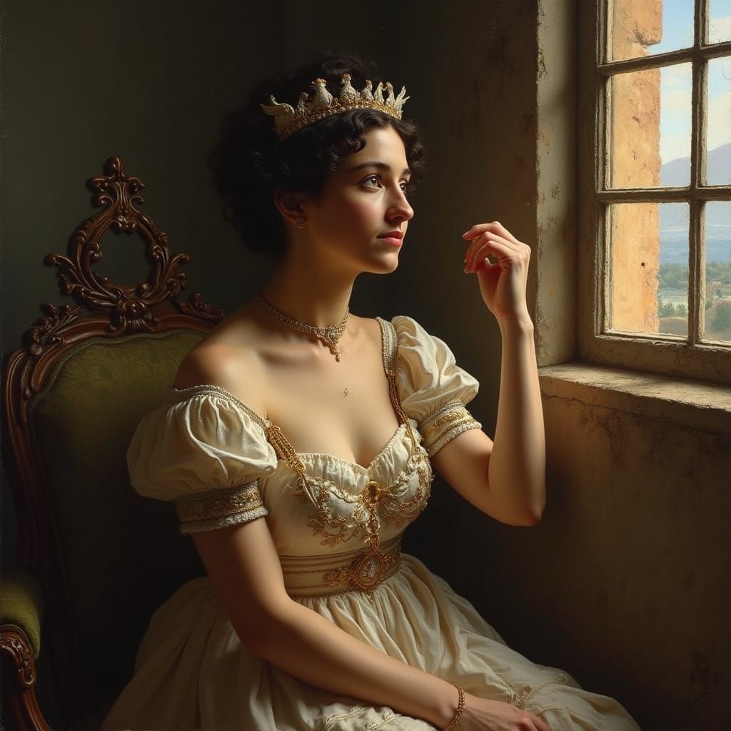 Pintura realista estilo misto gerome e delacroix, À luz tênue que atravessa a janela de pedra, a linda mulher libanesa de traços clássicos observa o vazio com olhos de âmbar. Sua pele, iluminada com detalhes, contrasta com o vestido de seda que ostenta um bordado de aves em voo. Sobre o móvel atrás dela, ...