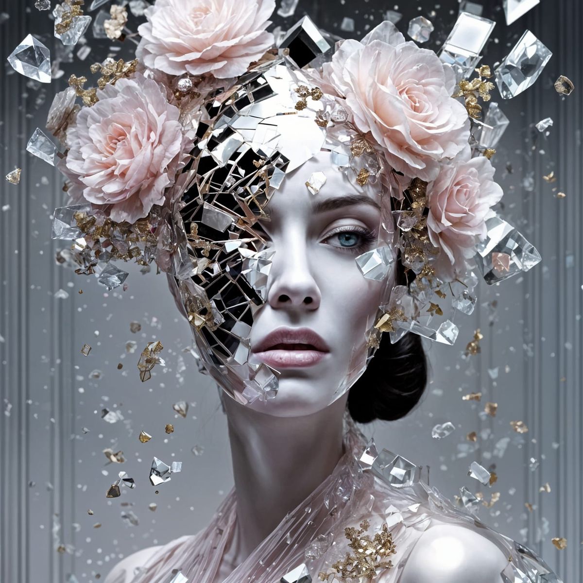 This image shows a girl wearing a shattered glass mask amidst crystal debris. The scene features pastel pink, white, and black colors with gold filigree and tropic flowers, as digital art.