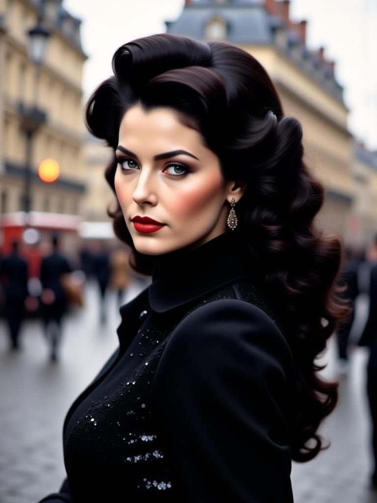 A profile portrait of Sauvanne, a beautiful woman with dark hair styled in the Hollywood Wave, wearing a black sequined jacket. The background depicts a street in Paris.