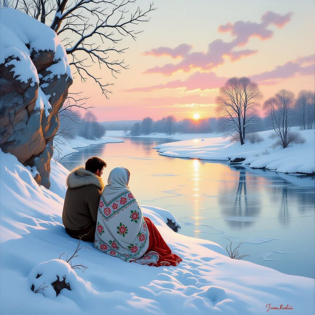 This image depicts a tender scene of two figures in a snowy hollow on a riverbank at dawn. Inspired by traditional Ukrainian folk art, it features soft, glowing morning light and a painterly style.