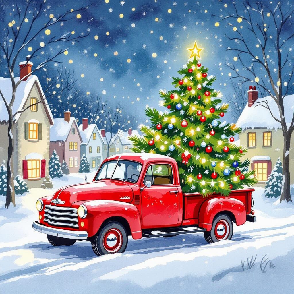 A charming watercolor of a red pickup truck with a Christmas tree in a snowy village square. The illustration is reminiscent of Beatrix Potter, featuring bold strokes and glossy, vibrant colors.