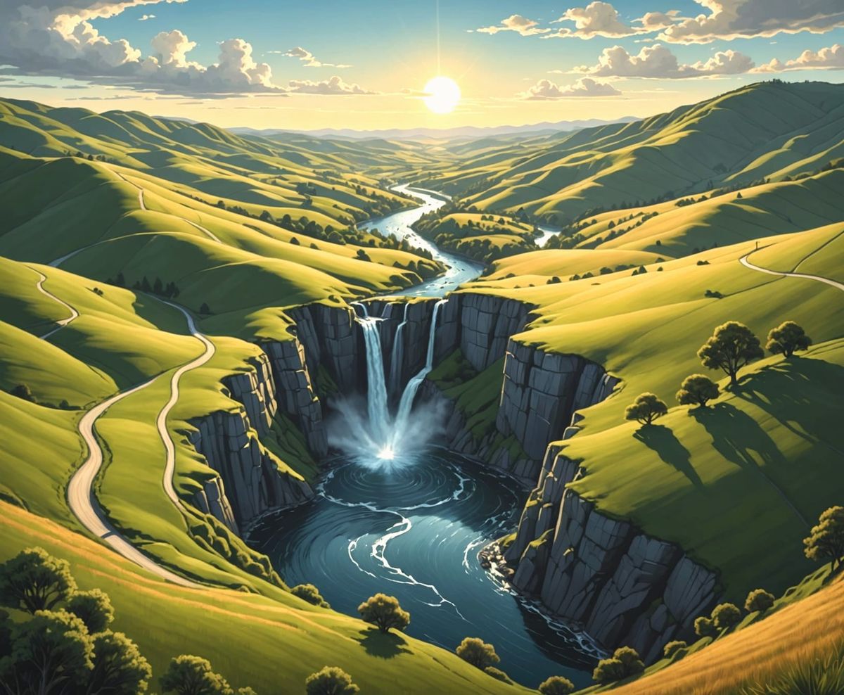 This image shows a pencil tip magically unfurling into a tiny, rolling landscape with a river. Rendered in a hyperrealistic, painterly style with magical lighting.
