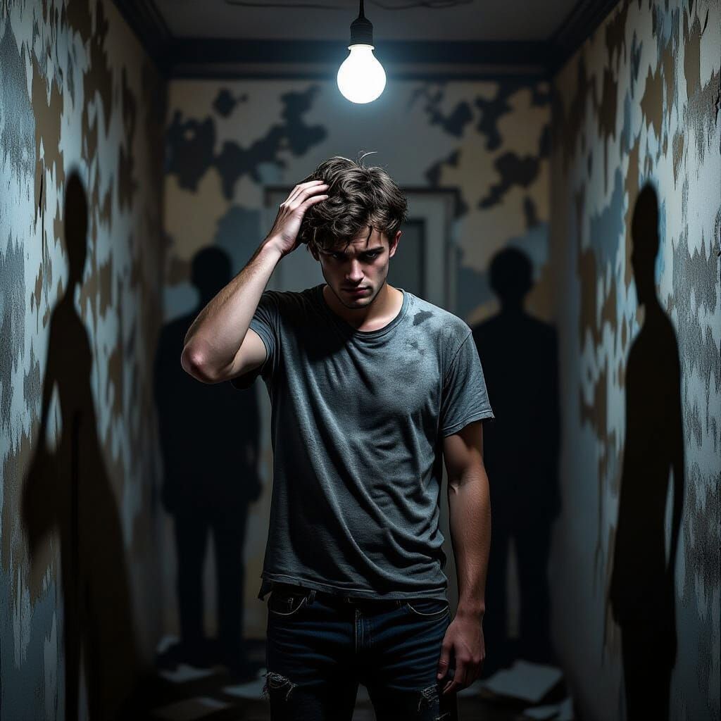 A hyperrealistic image of a disheveled young man in a dimly lit room. Eerie shadows and subtle silhouettes create a haunting, surreal atmosphere in a dark and dystopian style.