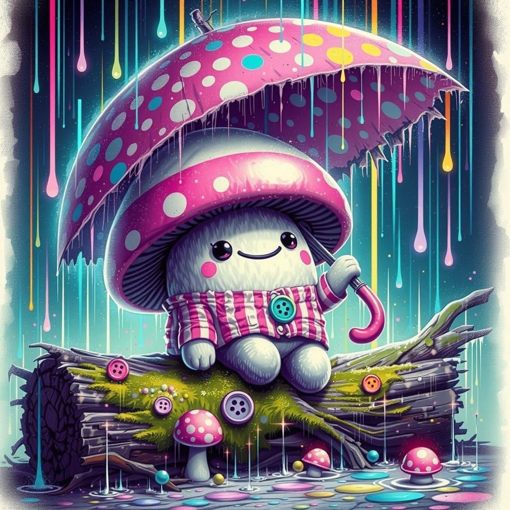 This image shows a whimsical mushroom spirit with a striped shirt and button eyes, holding a polka-dot umbrella in a surreal, candy-inspired world with glowing light.