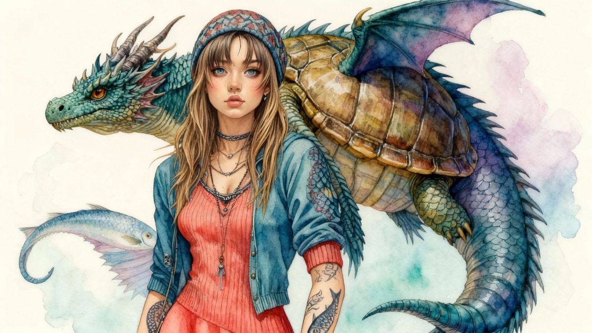 A limited-palette water-colour painting of a young woman (tortoise-pattern blue-cardigan over top of a light-poppy-red sweater-dress; wyvern-pattern toque; oarfish-pattern tattoos) standing in front of a "tortoise/dragon/oarfish chimeric hybrid" (tortoise body; draconic head; oarfish fins and tail). ...