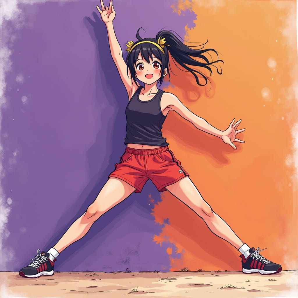 This image is a dynamic depiction of an anime girl performing splits on a sunny sports day, set against a vibrant purple and orange background with sharp lines and deep colors reminiscent of a high-quality manga scan aesthetic.