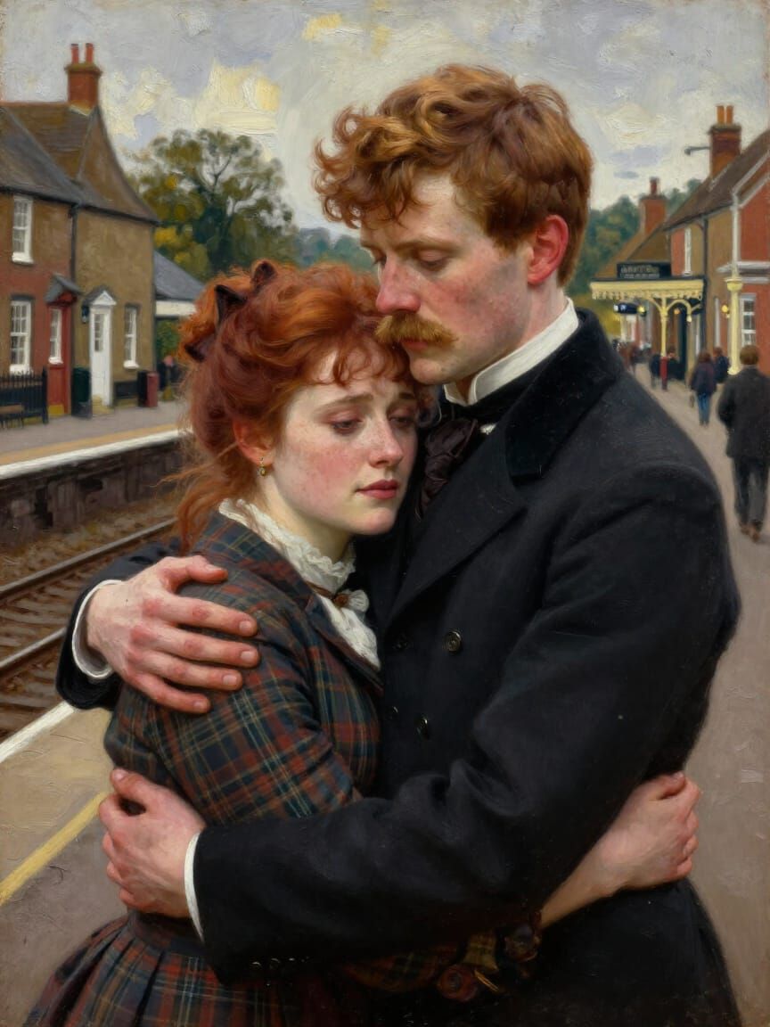 A young Victorian woman with auburn hair sadly embraces her brother goodbye at a train station, depicted with rich, impasto oil textures and dramatic lighting.
