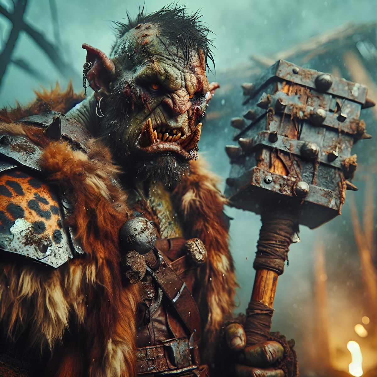 A striking picture of a goblin ogre with leopard-print skin and woodland armor. He stands in front of a swamp hut with a battle hammer, looking beaten and scared in a dystopian setting as digital art.