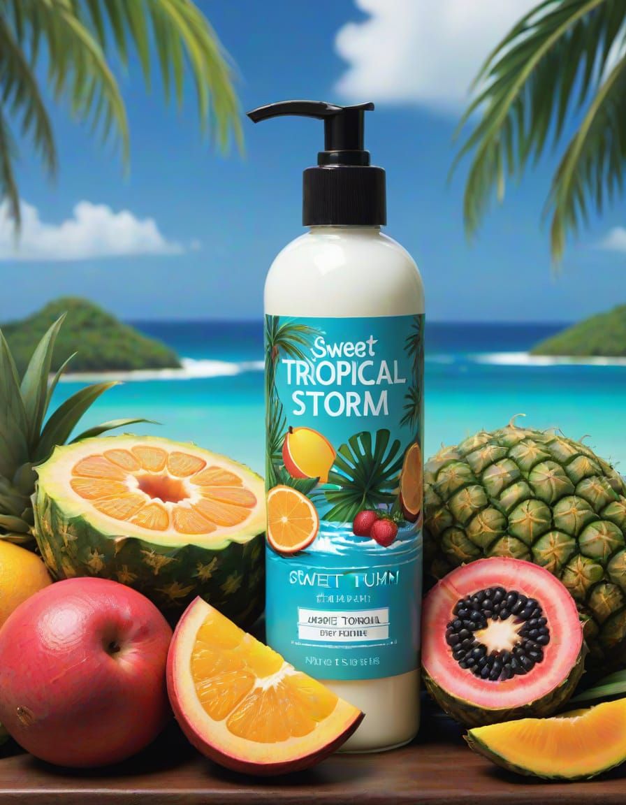 This image showcases a colorful lotion bottle label surrounded by lush tropical fruits, evoking a sense of tropical paradise amidst a whimsical stormy atmosphere.