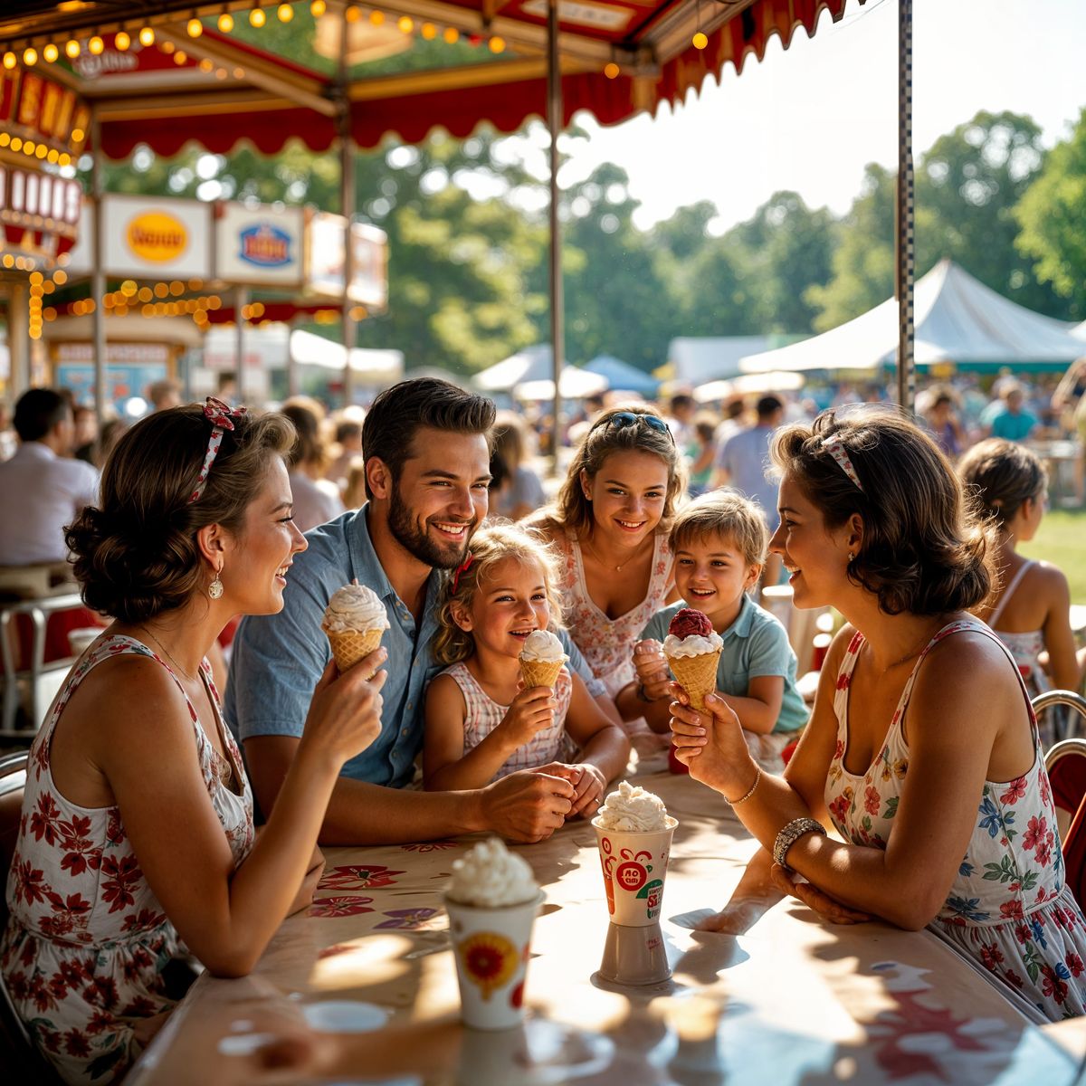 This image shows a vibrant county fair in 1960s Georgia. Families enjoy ice cream, animal contests, and thrilling rides, captured in realistic photography with natural lighting.