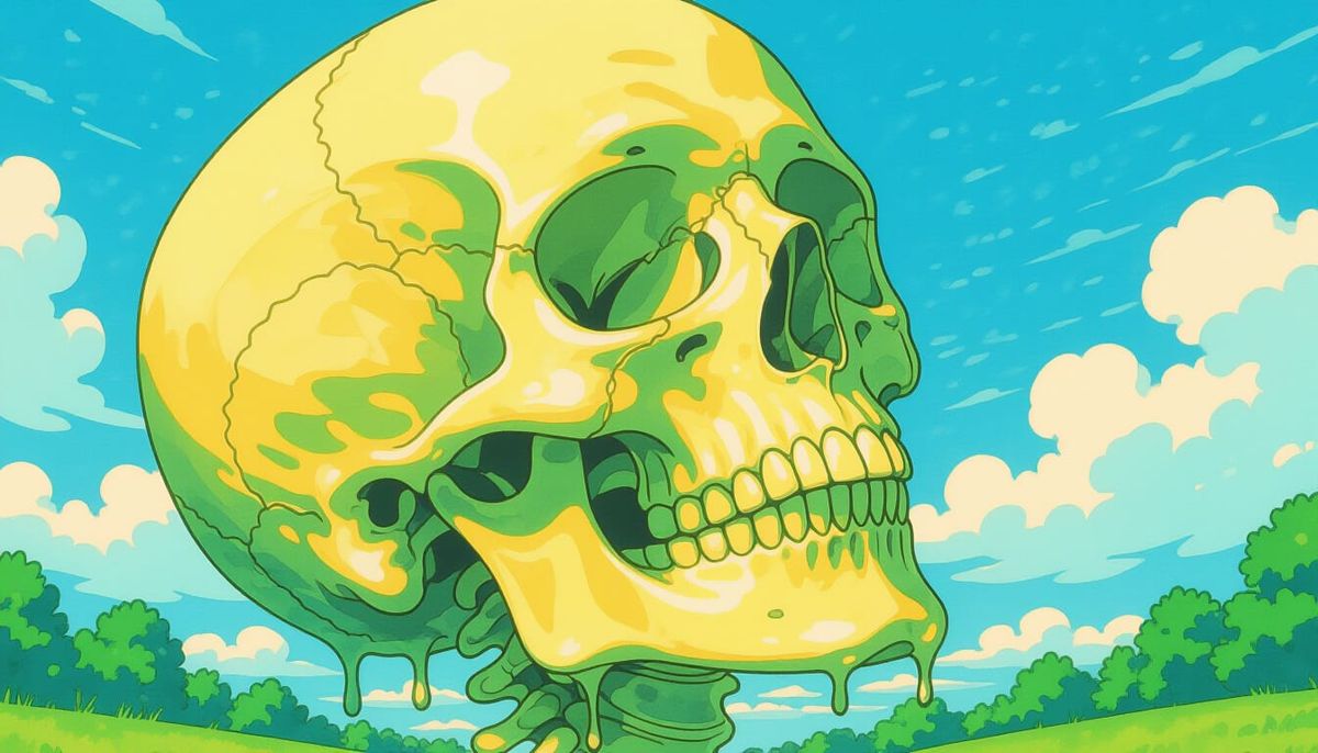 This image shows a brightly colored skull melting during the day under a clear sky. The artwork is reminiscent of gouache and watercolor paintings, with intricate details.
