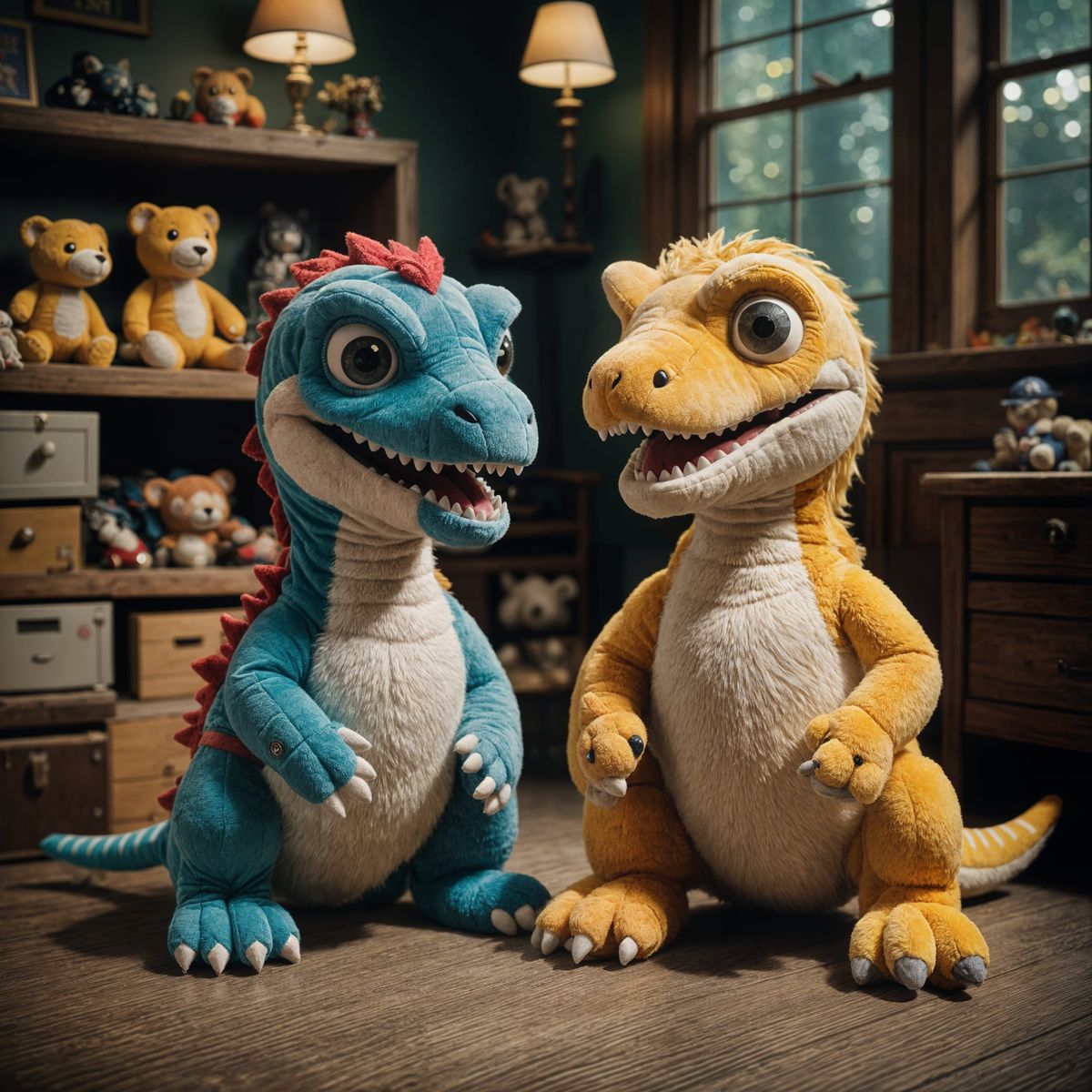 This cinematic film still features a dramatic and atmospheric scene with classic plush toys given a mischievous twist. Shot with cinematic lighting and film grain for a realistic, high-quality look.