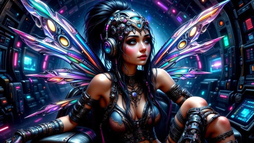 A striking picture of a cyberpunk fairy astronaut inside a retro rocket. The fairy is clad in patterned armor, holographic wings spread, gazing at nebulae in awe. As photorealistic digital art.