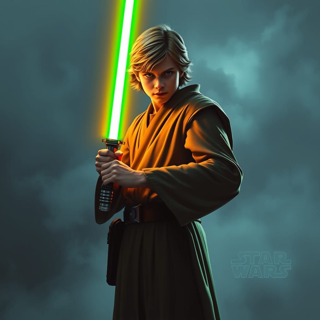 A heroic figure holds a vibrant green lightsaber in this futuristic, cinematic image. The artwork evokes a strong sense of atmosphere and is rendered in a digital art style.