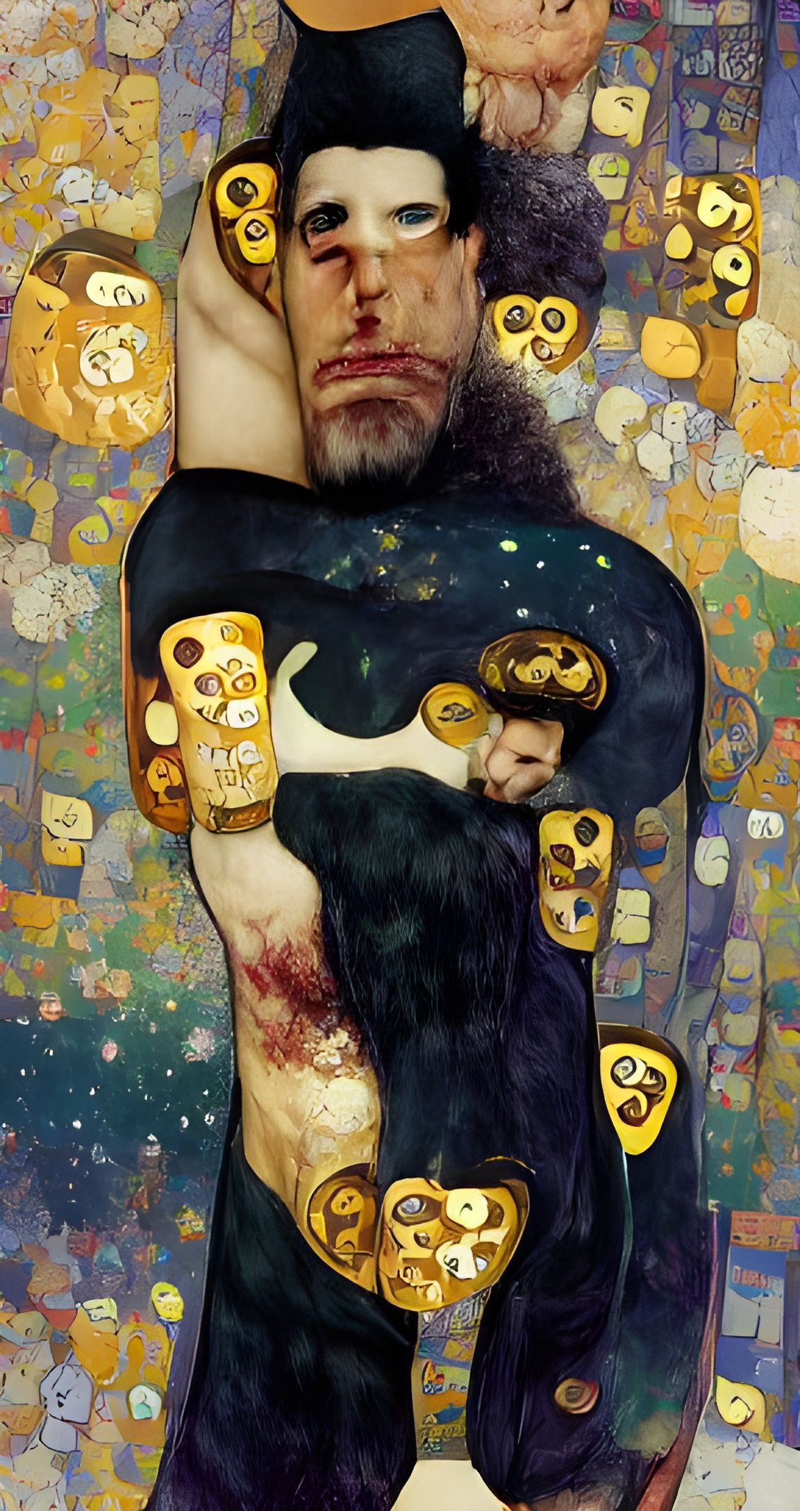A surreal image of The Punisher in Klimt's iconic gold-leaf style. The piece evokes melting oil on canvas, presented with 3D shading and cosmic illustration in a steampunk aesthetic.