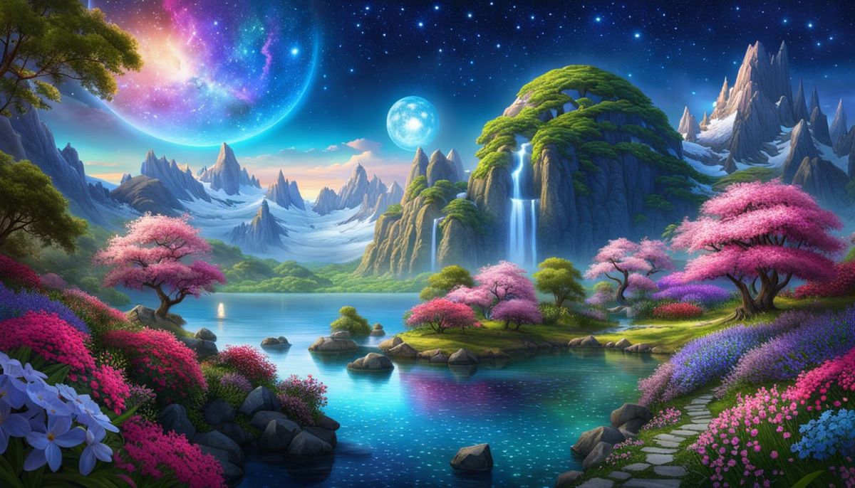 A vibrant fantasy landscape depicting a lush paradise under a starry sky. This image features bioluminescent flora and enchanted natural elements in a detailed, full-color composition.