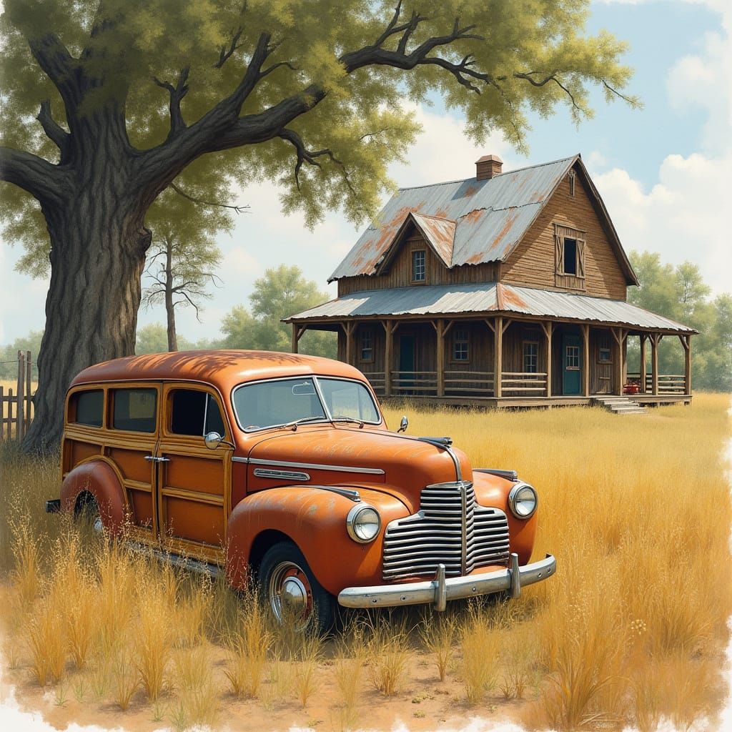 This watercolor painting depicts a 1941 Chevy 'Woody wagon' in a state of decay, nestled among tall weeds and a worn tobacco barn, under the shade of a majestic hickory tree, in a soft, wet style reminiscent of impressionist landscapes
