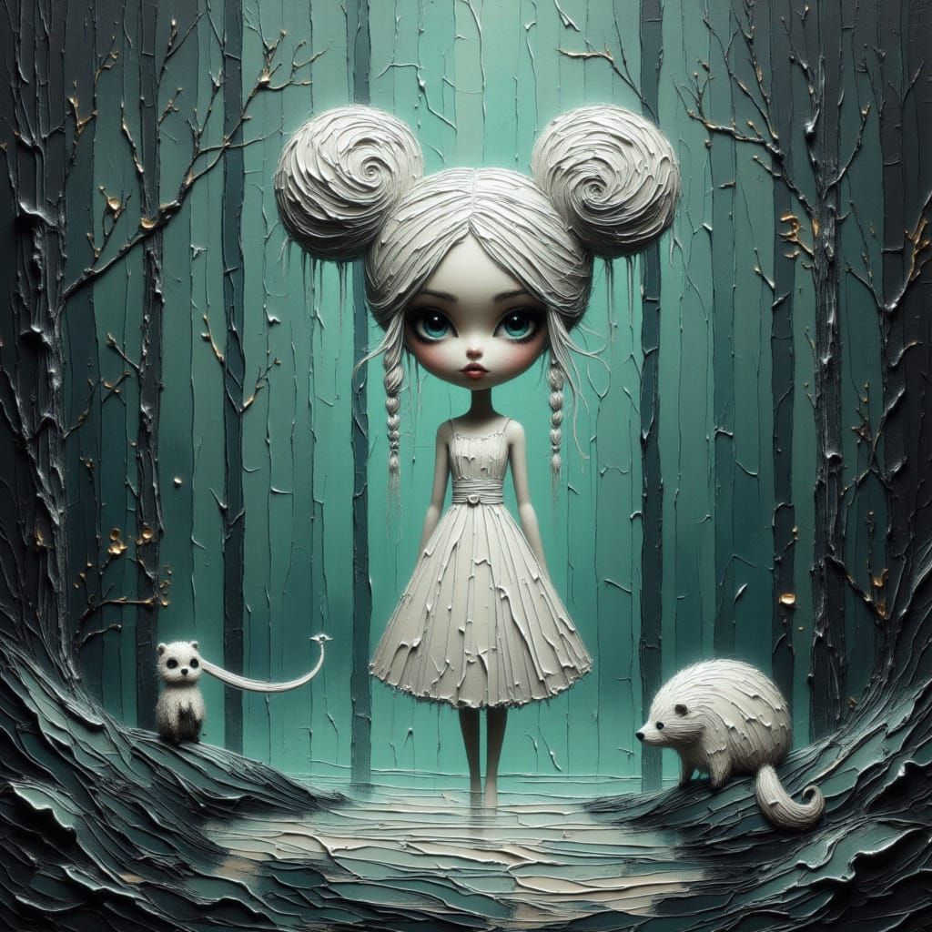 A striking picture of a woman with voluminous white hair in a cyberpunk forest, accompanied by a luminous otter spirit. The scene is rendered with painterly oil-style effects, heavy brushstrokes, and muted tones.