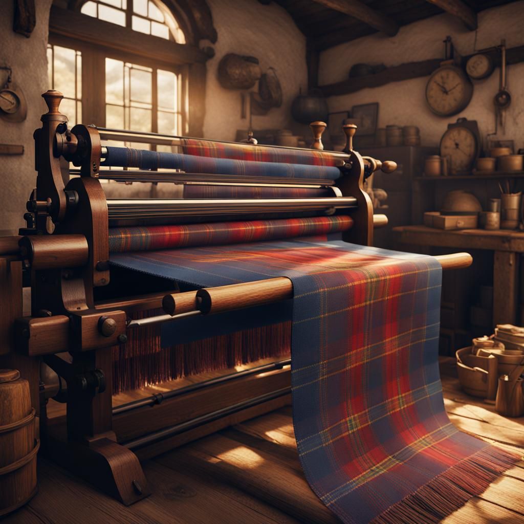 A detailed matte painting showing the weaving of Buchanan tartan on a loom inside a Scottish cottage. This fantasy concept art features deep color and intricate details in complementary colors.