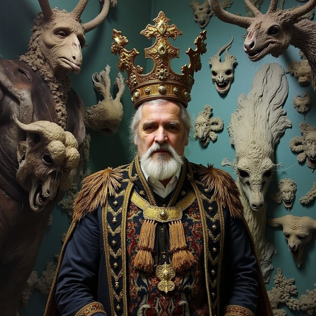 This image shows a macrocosmic reflection inspired by Otto Rapp and Hieronimus Bosch. The piece uses imperial colors and intricate details to create a mysterious fantasy oil painting.