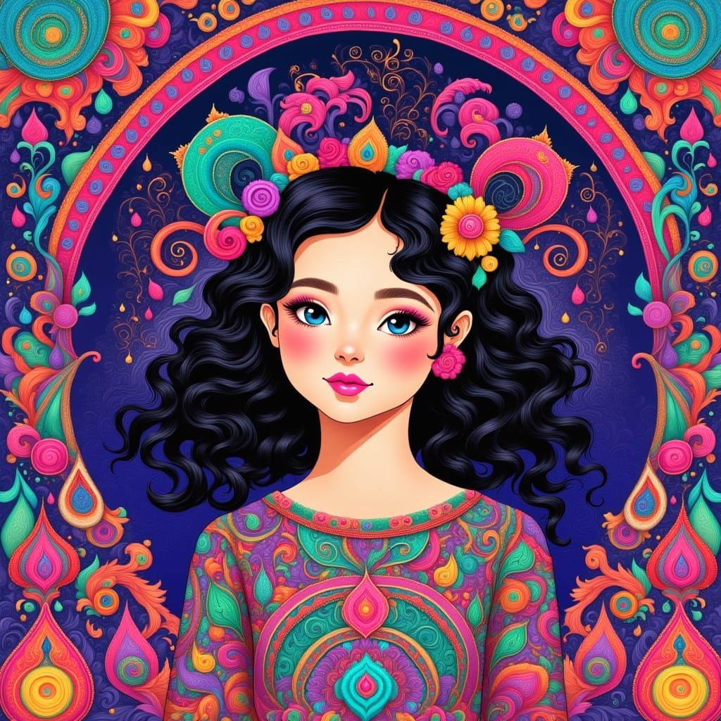 A young girl is surrounded by intricate paisley patterns, vibrant colors, and floral accents in a bold digital art style, featuring sharp lines, luminous highlights, and deep shadows.