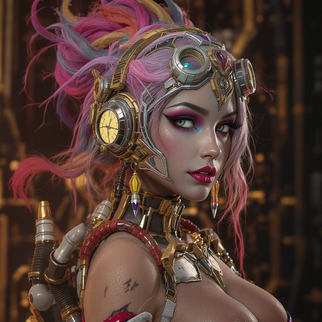 A detailed portrait of a beautiful woman with vibrant, futuristic steampunk style. The concept art features dynamic lighting and intricate details, rendered in high resolution.