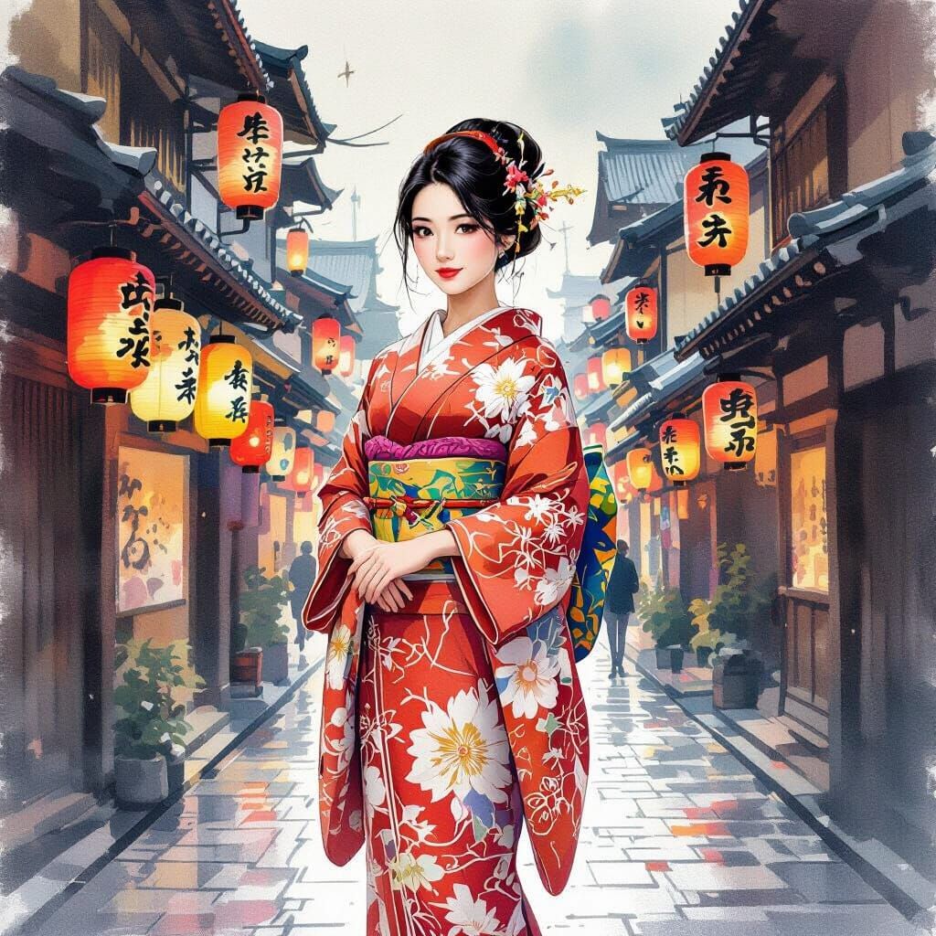 A woman in a kimono stands on a street in old Tokyo, surrounded by lanterns and historical buildings. The image is reminiscent of ukiyo-e and impressionist art.
