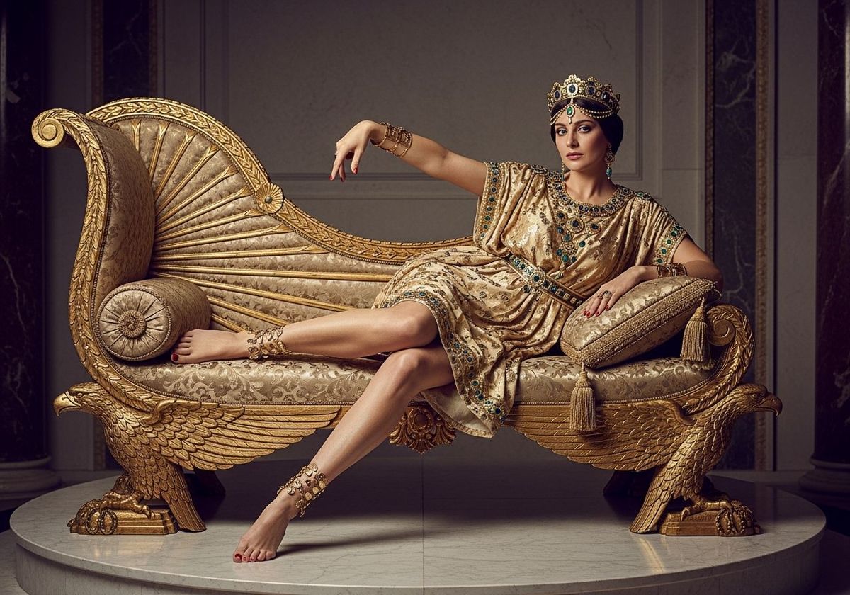 A photograph of Empress Theodora lounging on a chaise lounge in her throne room. She is adorned in gold and emeralds, photographed with natural lighting and sharp focus.