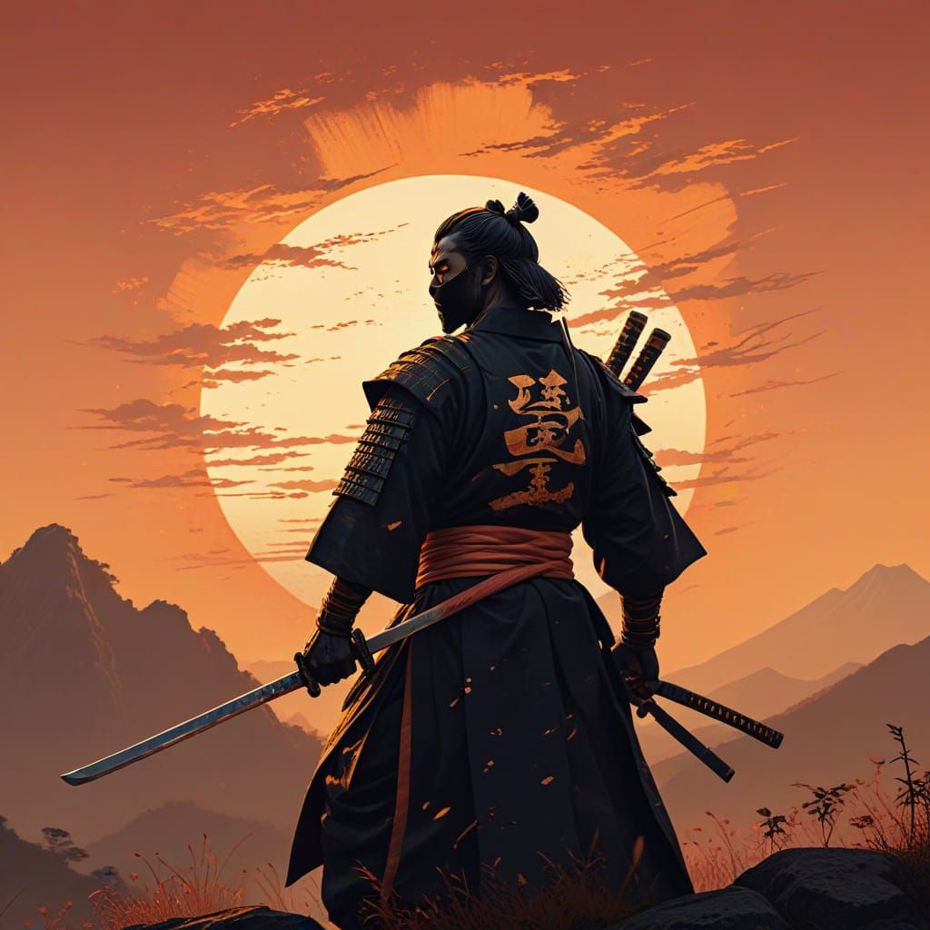 Concept art of a samurai in a kimono holding a katana against a vibrant orange sunset. The image features golden light on the blade and a warm color gradient, rendered in a bold, detailed ukiyo-e style.