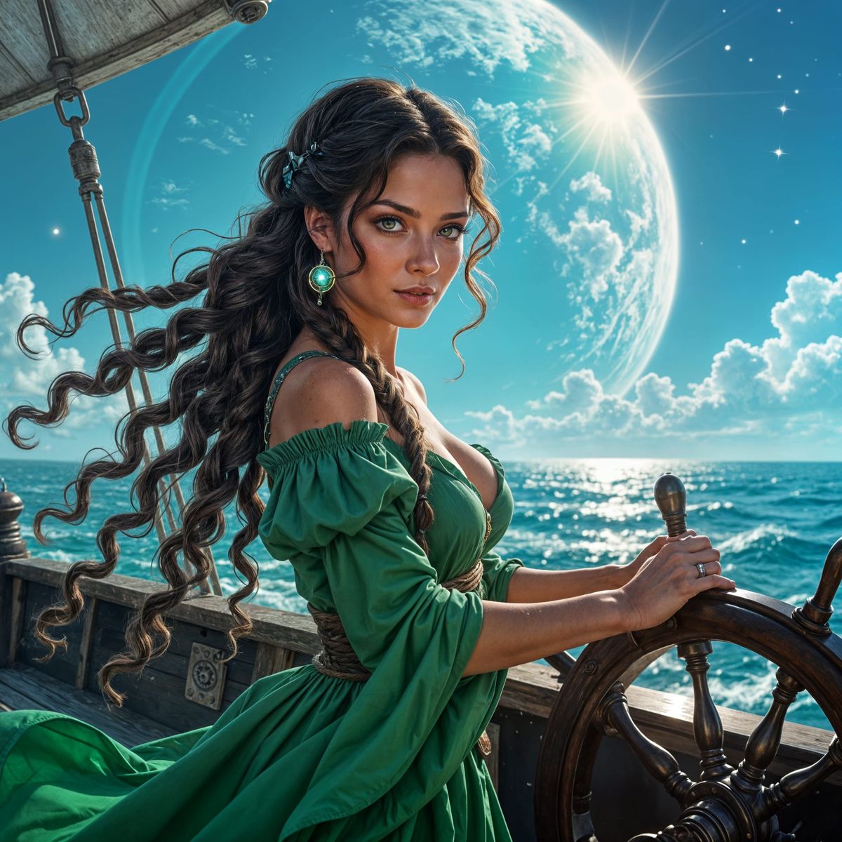 This image shows a pirate queen with long braided hair and green dress, steering her ship through space towards a radiant planet. The scene features atmospheric lighting in a futuristic style.