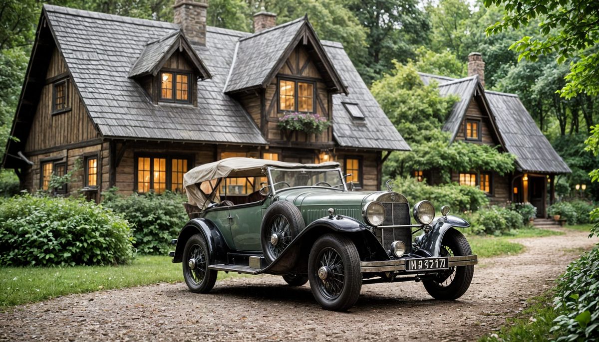 This image captures a serene scene of a classic 1927 Mercedes parked in front of a charming elven cottage nestled in the woods, bathed in warm natural light and precise focus.