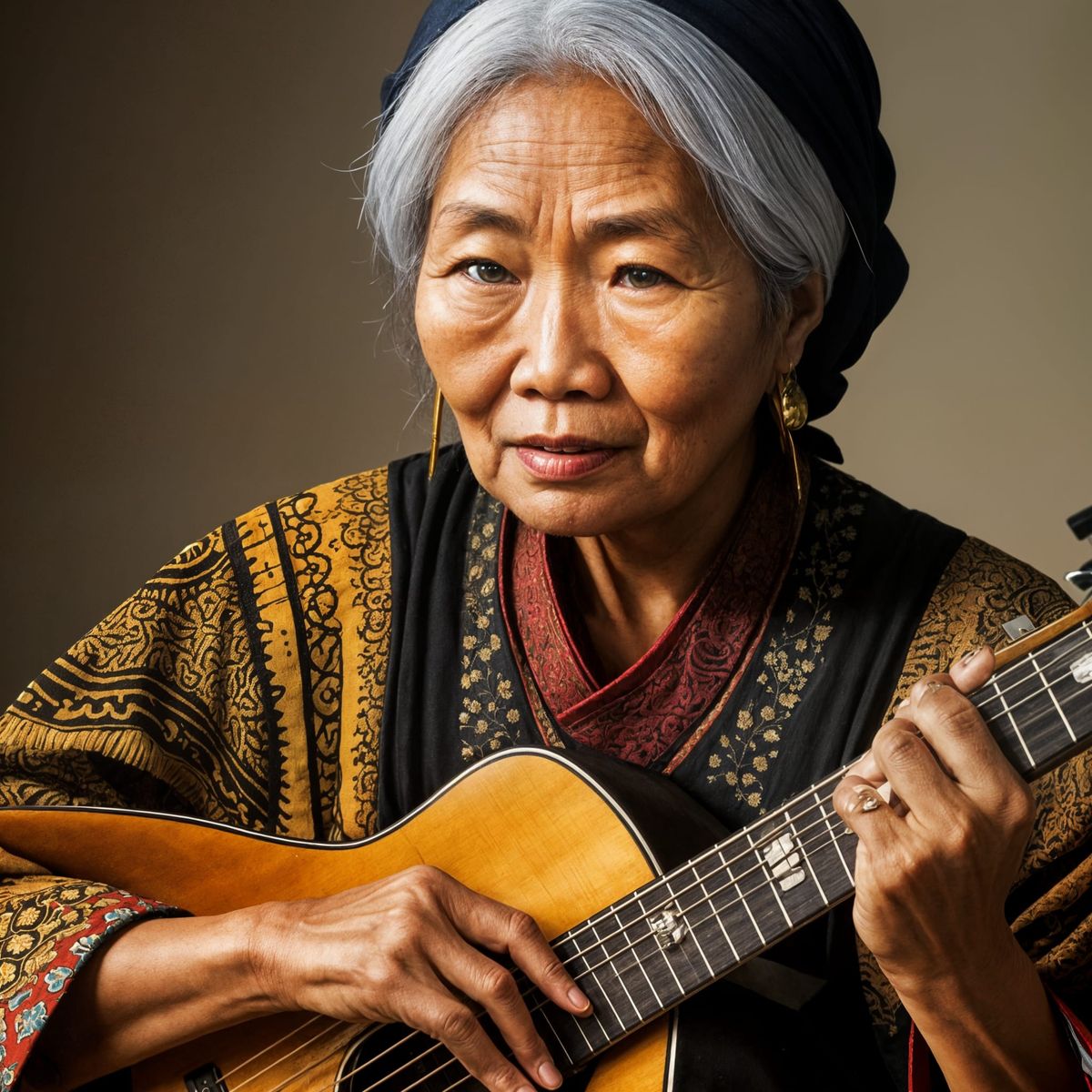 This image shows an elderly Indonesian woman playing guitar in traditional attire. The portrait, reminiscent of a warm oil painting, features soft lighting, intricate batik patterns, and earthy tones.