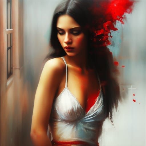 the girl in the subway by Paulina Olowska", perfect face. perfect eyes. looking at the camera. red background. intensely detailed. masterpiece. sharp. f2