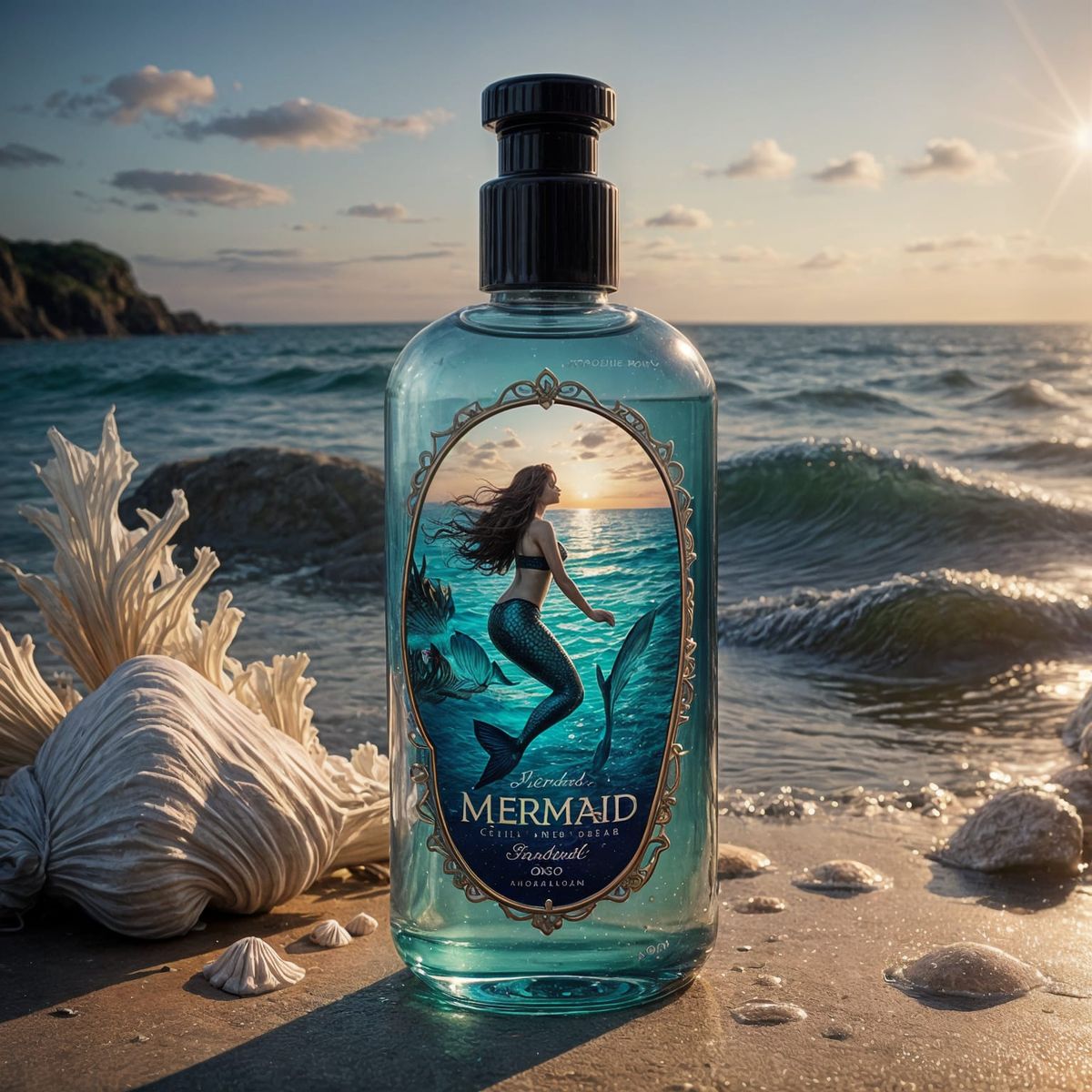 This image shows a high-end perfume bottle with a label that evokes the magic of the ocean, illuminated in a dramatic cinematic style with realistic lighting effects.