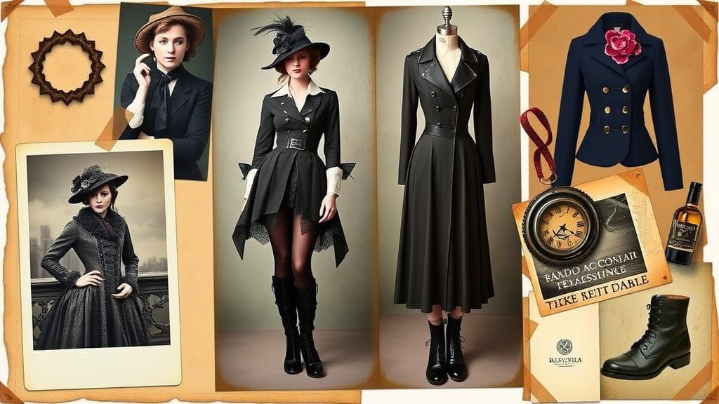 This image showcases a steampunk-inspired fashion mood board with vintage elements, blending intricate details and classic elegance.