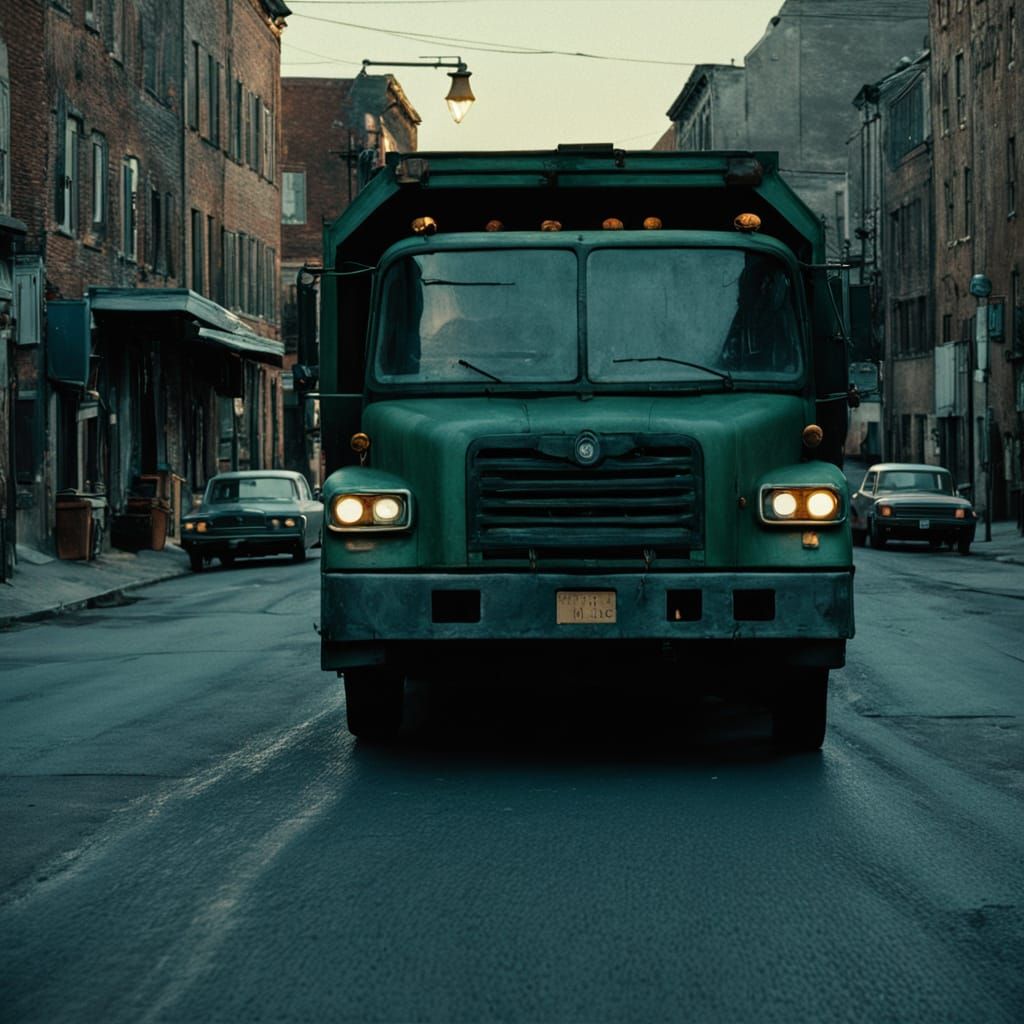 This striking image captures a man driving a garbage truck down a street at dusk. Shot with film grain and a vignette, the scene features gritty textures and dramatic, moody lighting.