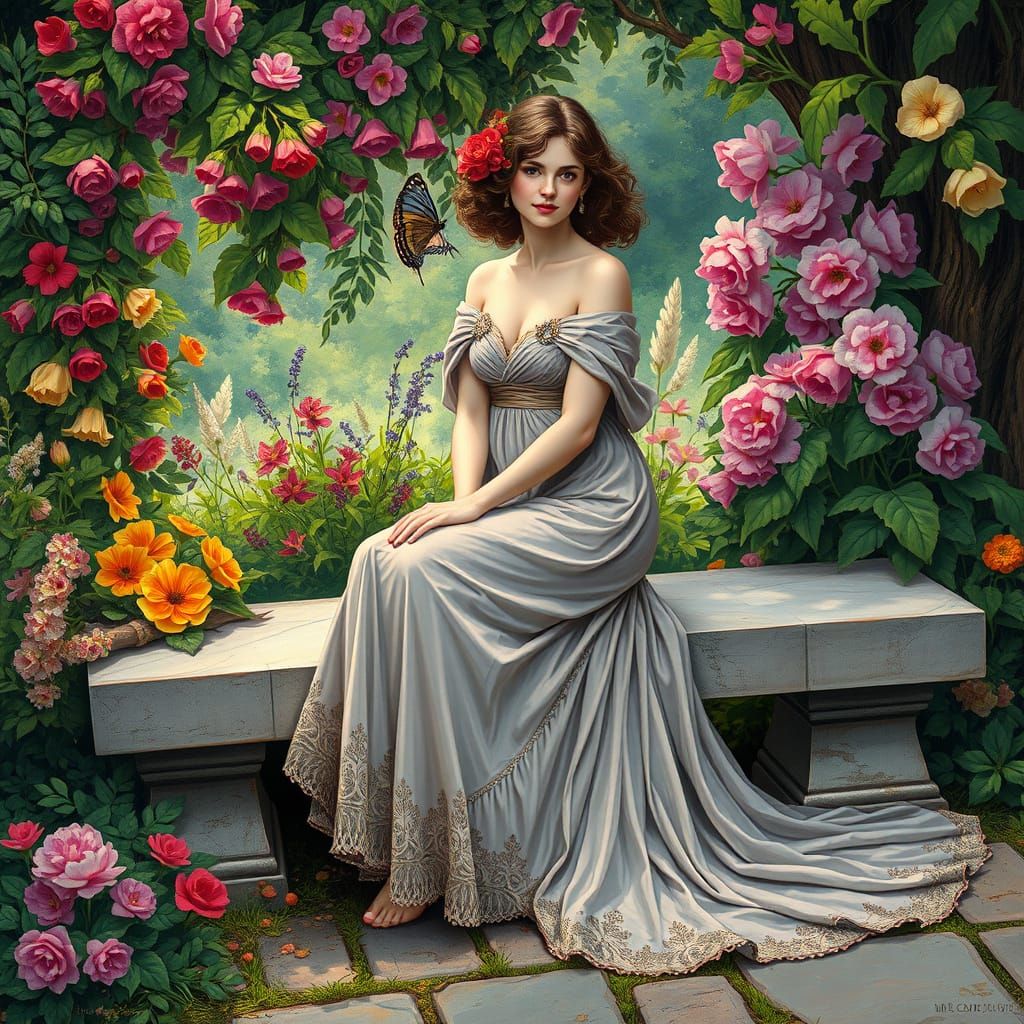 This image features a woman sitting on a stone bench, surrounded by lush greenery and vibrant flowers, in the style of Art Nouveau with intricate details reminiscent of Alphonse Mucha's works.