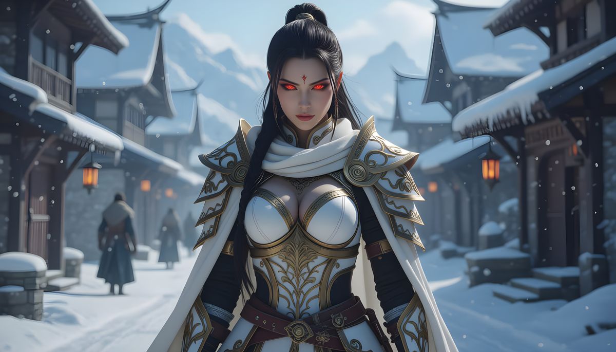 A hyperrealistic image of a warrior woman with glowing red eyes and a mystical aura, clad in white and gold armor and silk, standing in a moody, snow-covered medieval village.