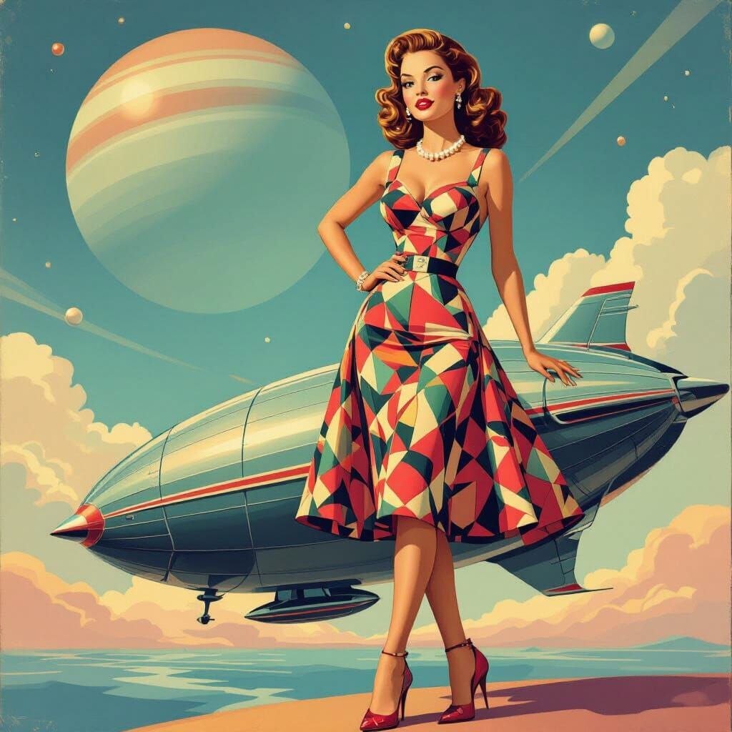 A vintage pin-up girl poses by a futuristic airship against a celestial backdrop. This image blends pop art and art deco styles with a nod to futuristic landscapes, creating a surreal scene.